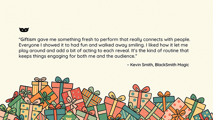 "Giftism gave me something fresh to perform that really connects with people. Everyone I showed it to had fun and walked away smiling. I liked how it let me play around and add a bit of acting to each reveal. It's the kind of routine that keeps things engaging for both me and the audience."
