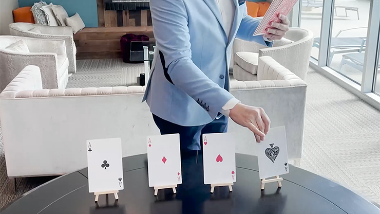A surprising ace assembly that you'll forever incorporate into your repertoire. You show four aces and twelve indifferent cards that are placed on the table. Three cards are dealt onto each ace, creating one pile with each ace. The aces disappear completely one by one from the three piles to reunite together in the fourth one.