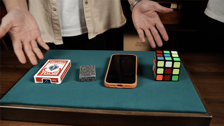 The magician borrows four random everyday items from the audience - a wallet, phone, air pod, or any small object the spectator is carrying. All items are placed openly on the close-up pad.