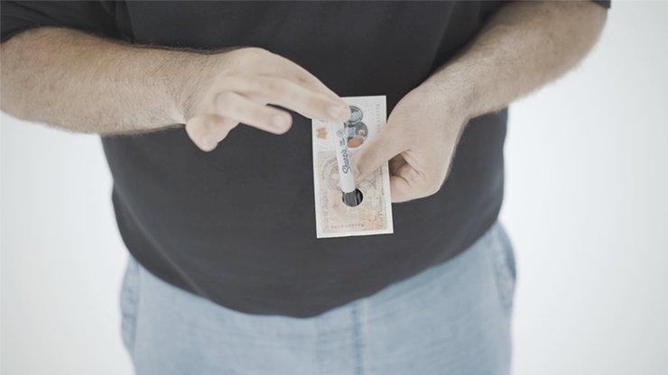 Black Lips turns a simple black sticker into a real, physical black hole. A borrowed and signed bill receives a round black sticker... and that sticker becomes a Black Hole through which objects can genuinely pass.