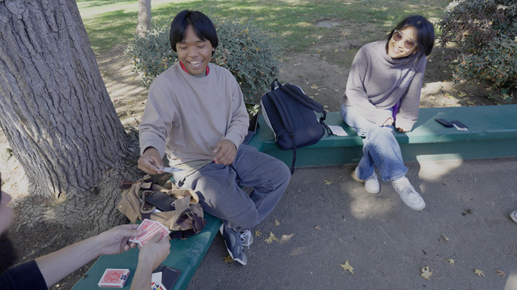 Both spectators hold their packets far apart, isolating the cards and eliminating any possibility of trickery... or so they think.